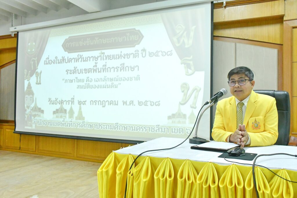 วันอังคารที่ 29 กรกฎาคม 2568 เวลา 09.00 น. นายศุภพงษา จันทรังษ์ ผอ.สพป.นครราชสีมา เขต 6 เป็นประธานพิธีเปิดการแข่งขันทักษะภาษาไทย เนื่องในสัปดาห์วันภาษาไทยแห่งชาติ ปี 2568 “ระดับเขตพื้นที่การศึกษา” (ภาษาไทย คือ เอกลักษณ์ของชาติ สมบัติของแผ่นดิน) พร้อมบรรยายพิเศษ ณ ห้องประชุมปุณฑริก สพป.นครราชสีมา เขต 6 (หลังเดิม) และเยี่ยมชมให้กำลังใจคณะกรรมการ และนักเรียน ที่เข้าร่วมแข่งขัน ณ ห้องประชุมปุณฑริก (หลังเดิม) ห้องประชุมวานิชอนุสรณ์ และห้องประชุม KM ชั้น 3 สพป.นครราชสีมา เขต 6