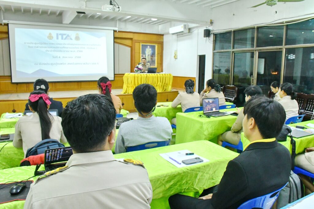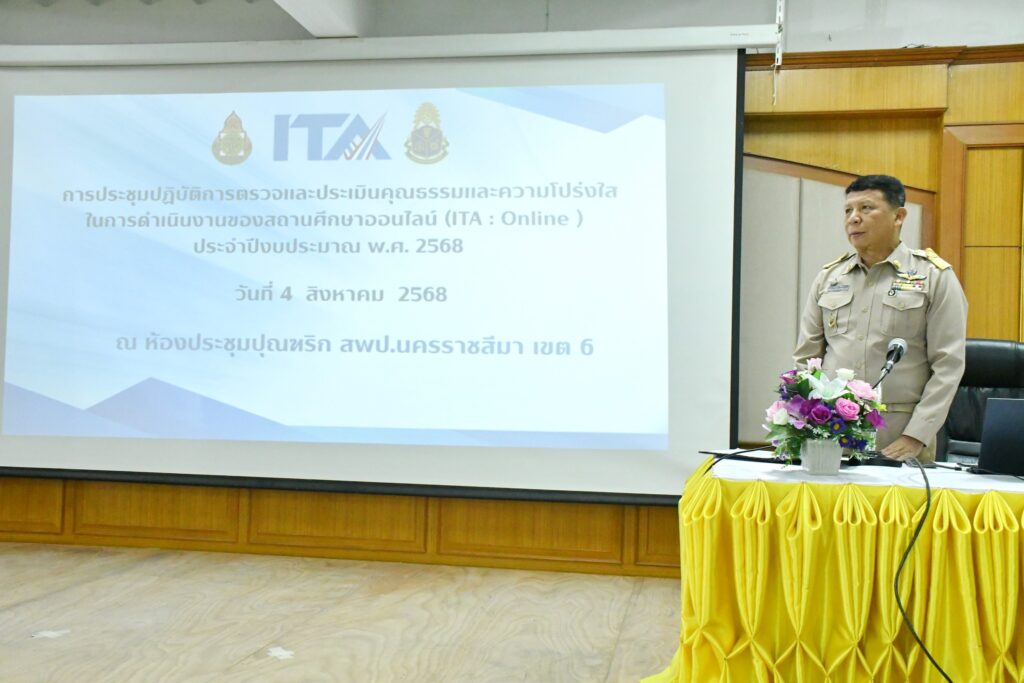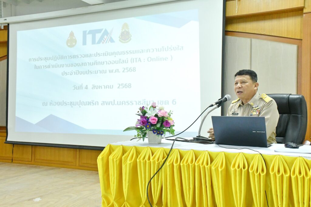 วันจันทร์ที่ 4 สิงหาคม 2568 เวลา 09.00 น. นายศุภพงษา จันทรังษ์ ผอ.สพป.นครราชสีมา เขต 6 มอบหมายให้ นายธนภัทร สิริวาส รอง ผอ.สพป.นครราชสีมา เขต 6 เป็นประธานเปิดการประชุมเชิงปฏิบัติการตรวจและประเมินคุณธรรมและความโปร่งใส ในการดำเนินงานของสถานศึกษาออนไลน์ (ITA:Online) ประจำปีงบประมาณ พ.ศ. 2568 พร้อมบรรยายพิเศษ ณ ห้องประชุมปุณฑริก สพป.นครราชสีมา เขต 6 (หลังเดิม)