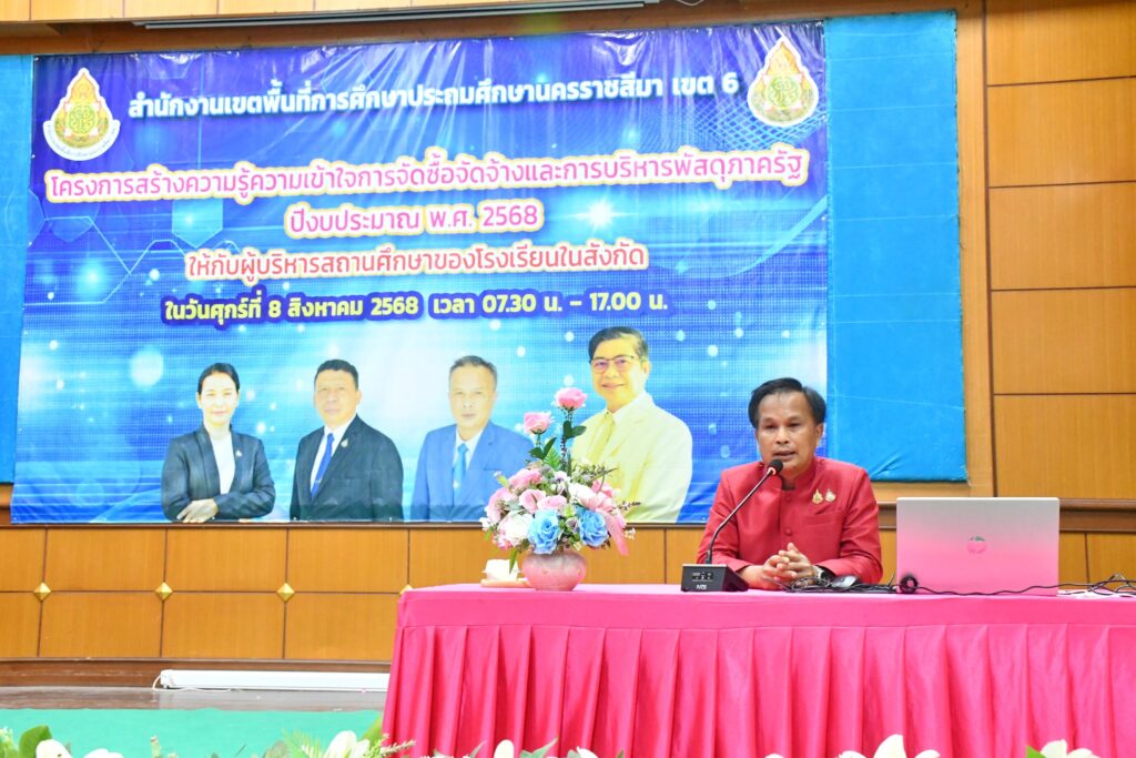วันศุกร์ที่ 8 สิงหาคม 2568 เวลา 08.30 น. นายศุภพงษา จันทรังษ์ ผอ.สพป.นครราชสีมา เขต 6 มอบหมายให้ นายสมชัย นิยันตัง รอง ผอ.สพป.นครราชสีมา เขต 6 เป็นประธานพิธีเปิดการอบรม “โครงการสร้างความรู้ความเข้าใจการจัดซื้อจัดจ้างและการบริหารพัสดุภาครัฐ ประจำปีงบประมาณ พ.ศ. 2568” ให้กับผู้บริหารสถานศึกษาของโรงเรียนในสังกัด พร้อมบรรยายพิเศษ ณ หอประชุม 59 ปี โรงเรียนบัวใหญ่ อำเภอบัวใหญ่ จังหวัดนครราชสีมา