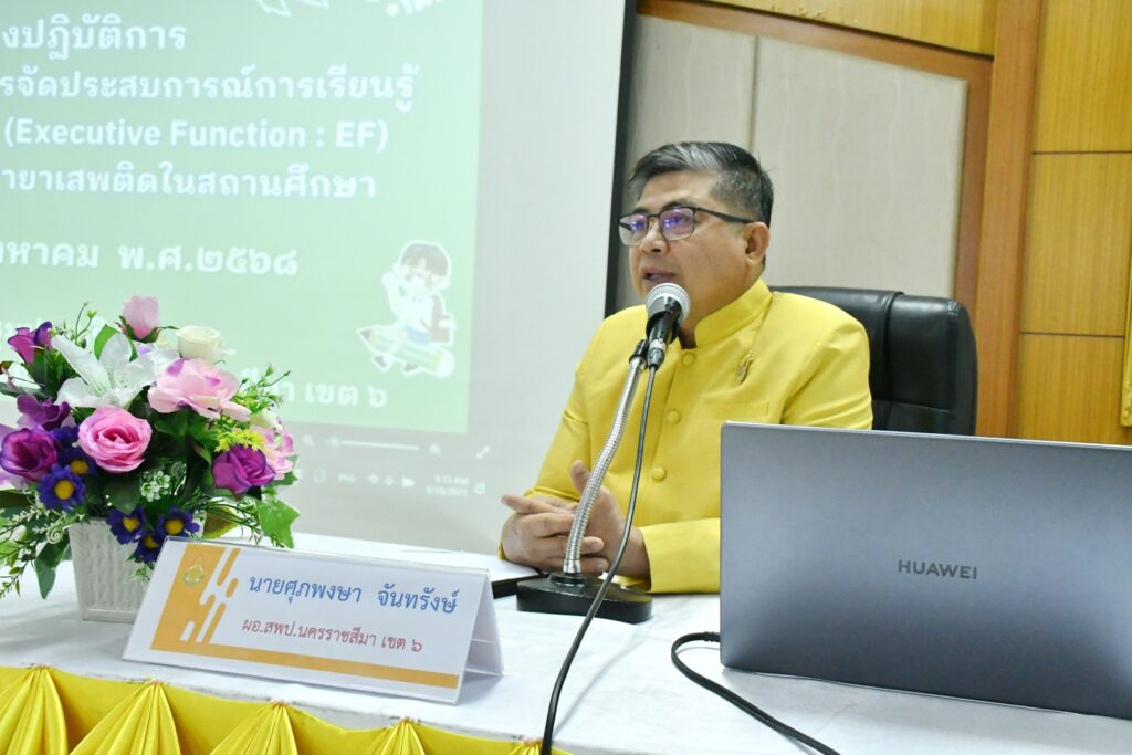 วันจันทร์ที่ 18 สิงหาคม 2568 เวลา 09.00 น. นายศุภพงษา จันทรังษ์ ผอ.สพป.นครราชสีมา เขต 6 เป็นประธานเปิดการอบรมเชิงปฏิบัติการพัฒนาครูผู้สอนปฐมวัยในการจัดประสบการณ์เรียนรู้ เพื่อพัฒนาทักษะทางสมอง (Executive Function : EF) ในการป้องกันและแก้ไขปัญหายาเสพติดในสถานศึกษา พร้อมบรรยายพิเศษ ณ ห้องประชุมปุณฑริก สพป.นครราชสีมา เขต 6 (หลังเดิม)