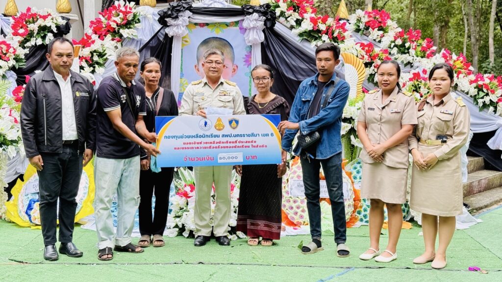 วันจันทร์ที่ 25 สิงหาคม 2568 เวลา 15.00 น. นายศุภพงษา จันทรังษ์ ผอ.สพป.นครราชสีมา เขต 6 เป็นประธานในพิธีฌาปนกิจศพ เด็กชายชัยยศ สัตพันธ์ นักเรียนชั้นประถมศึกษาปีที่ 5 โรงเรียนบ้านโนนสำราญ พร้อมมอบเงินกองทุนช่วยเหลือนักเรียน สพป.นครราชสีมา เขต 6 ให้กับครอบครัวของนักเรียนที่เสียชีวิต จำนวน 10,000 บาท ณ เมรุวัดป่าบ้านหนองจาน ต.โนนสำราญ อ.แก้งสนามนาง จ.นครราชสีมา