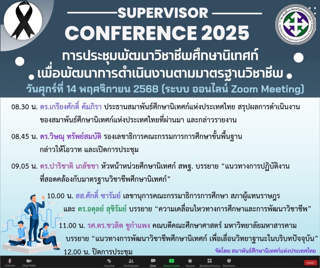 วันศุกร์ที่ 14 พฤศจิกายน 2568 เวลา 09.00 น. นายธนภัทร สิริวาส รอง ผอ.สพป.นครราชสีมา เขต 6 รักษาราชการแทน ผอ.สพป.นครราชสีมา เขต 6 พร้อมด้วย กลุ่มนิเทศ ติดตาม และประเมินผลการจัดการศึกษา ร่วมการประชุมพัฒนาวิชาชีพศึกษานิเทศก์ เพื่อพัฒนาการดำนินงานตามมาตรฐานวิชาชีพ SUPERVISER CONFERENCE 2025 ผ่านระบบออนไลน์ Zoom Meeting ณ ห้องประชุมวานิชอนุสรณ์ ชั้น 3 สพป.นครราชสีมา เขต 6