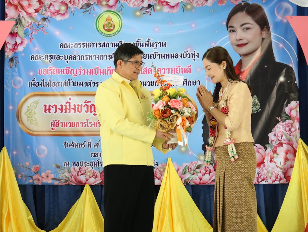 แสดงความยินดีกับ นางมิ่งขวัญ บูรณปรีชา ผอ.รร.บ้านสี่เหลี่ยม เนื่องในโอกาสย้ายไปดำรงตำแหน่ง ผอ.รร.บ้านหนองบัวทุ่ง